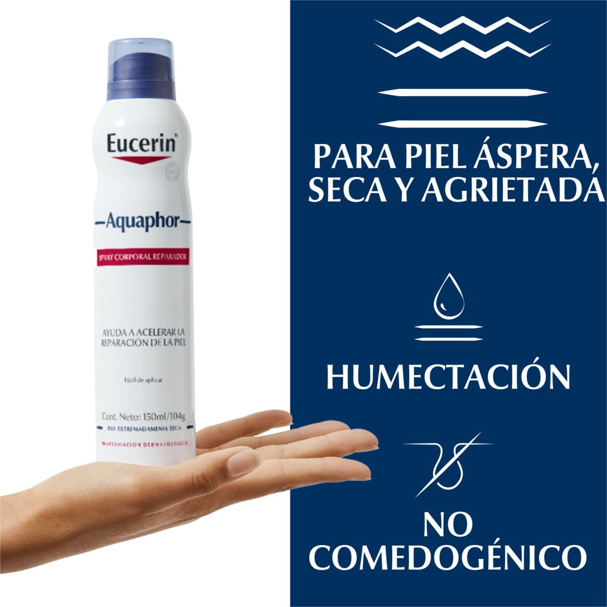 Para un alivio inmediato y de fácil aplicación en áreas más extensas del cuerpo, creamos Eucerin Aquaphor Spray Reparador. Este formato permite una aplicación fácil en zonas extensas del cuerpo. Además, se puede usar al revés, lo que permite un acceso de 360° en cualquier parte del cuerpo. Está clínicamente comprobado que Eucerin Aquaphor Spray Reparador repara la piel seca y agrietada al crear una barrera protectora ideal para la reparación de la piel, brindando una sensación de alivio inmediato.
